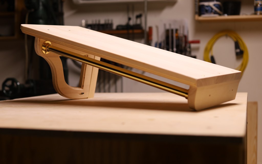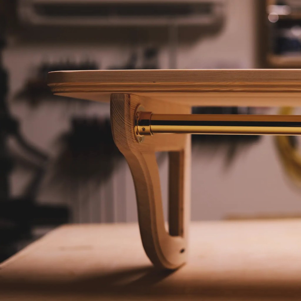Klädhylla i furu och obehandlad mässing för montering i hörn. Kunden önskade en något djupare modell än en klassisk hatthylla för att rymma kläder på galgar.