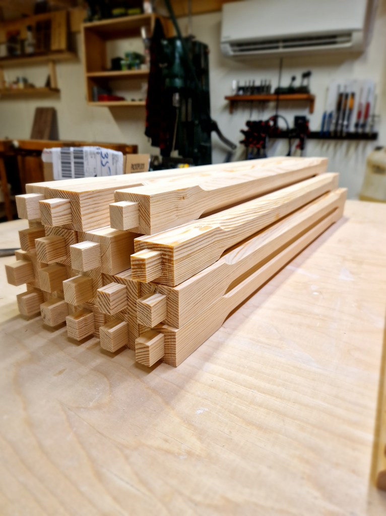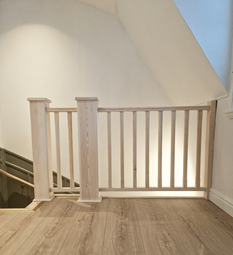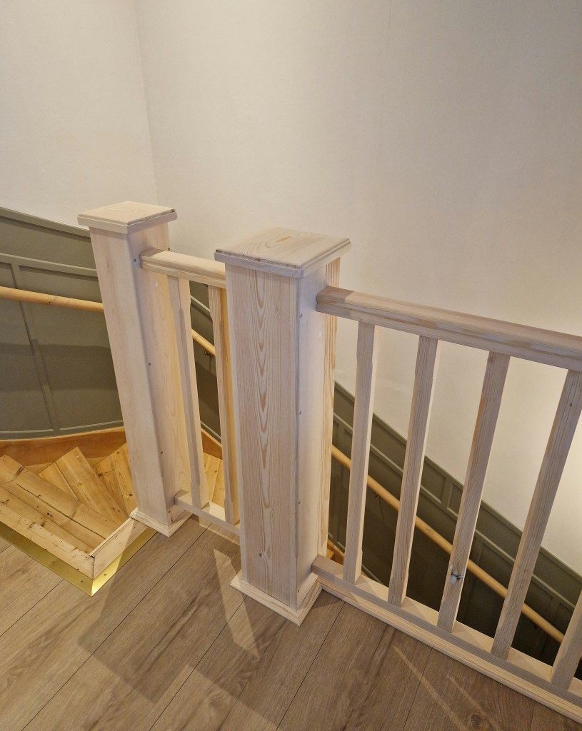 Trappräcke i furu med frästa spjälor. Kunden ville behålla och klä in befintliga stolpar.