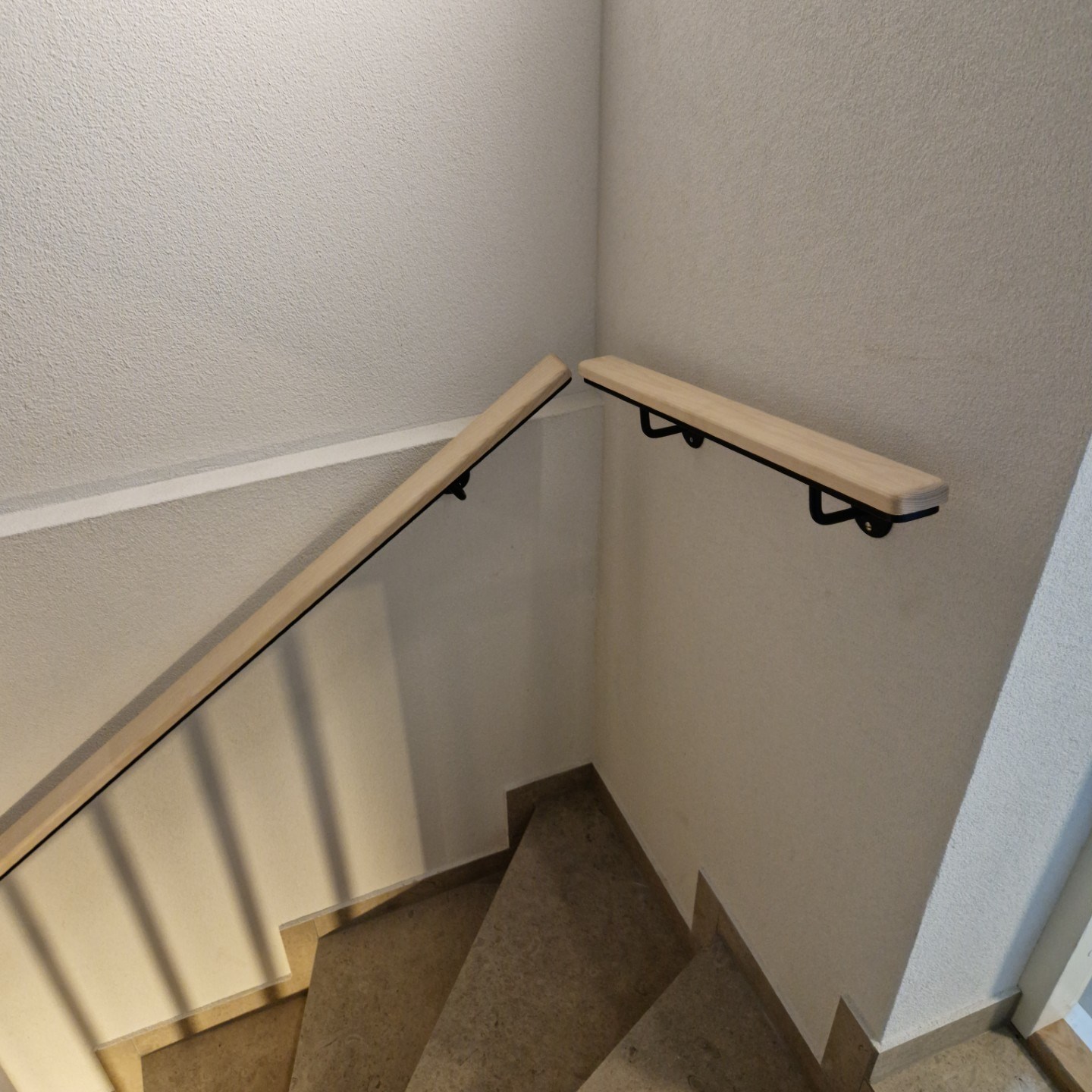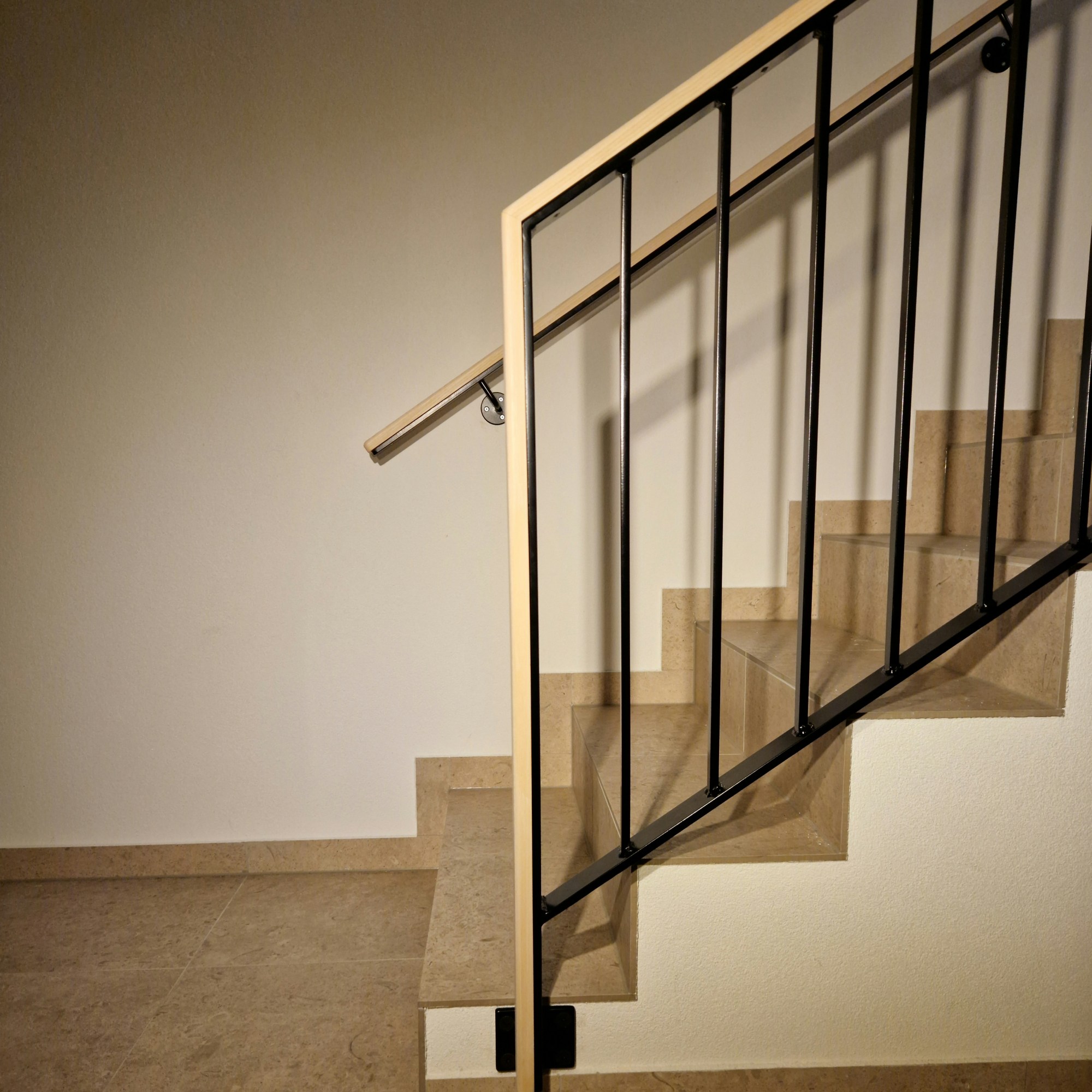 Innan jag började med snickeriverksamhet på heltid, arbetade jag nio år som smed. Det är trevligt att kunna kombinera trä och stål i mina uppdrag, här ett trappräcke i stål och handledare inklädd i vitpigmenterad ask.