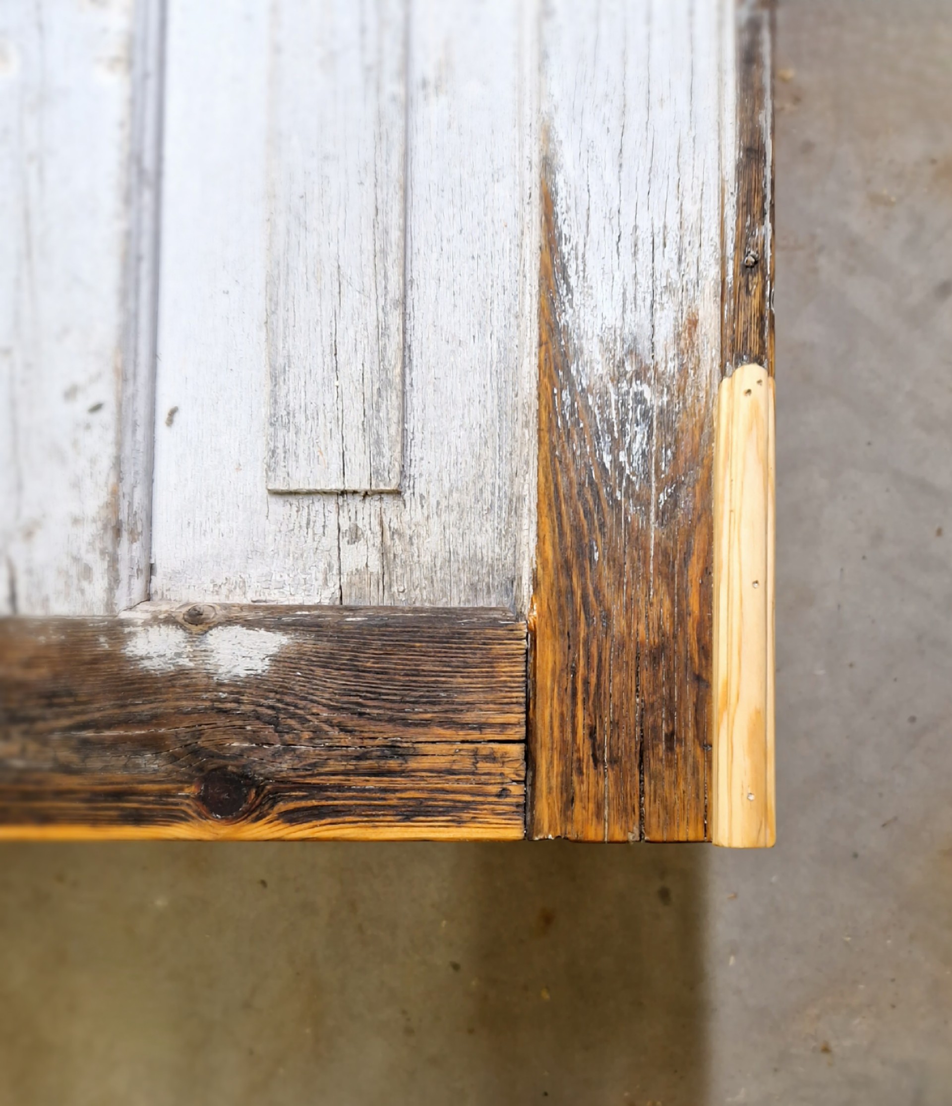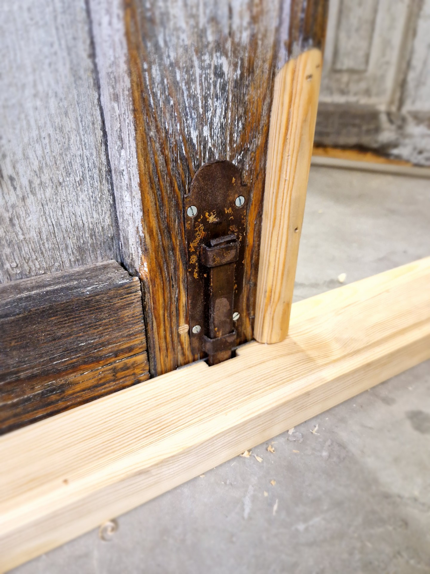 Jag är nog inte ensam om att gilla äldre pardörrar, men ganska ofta kan de behöva fräschas upp. Delar av dörrbladet kan behöva nytt trä, en ruta kan behöva bytas eller kittas om och det kan saknas funktionsdugliga beslag. Här en pardörr till ett orangeri med klassiska gångjärn och snickeridetaljer.